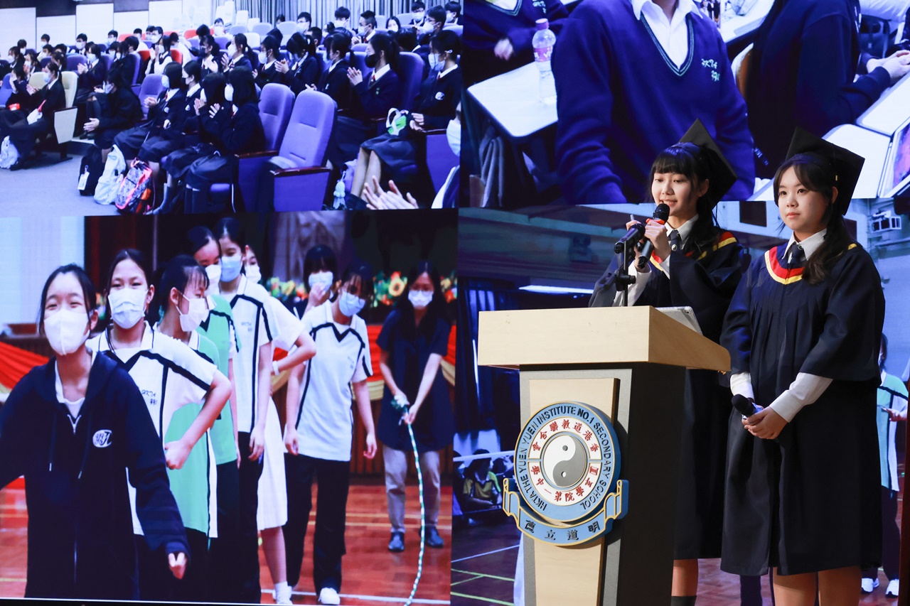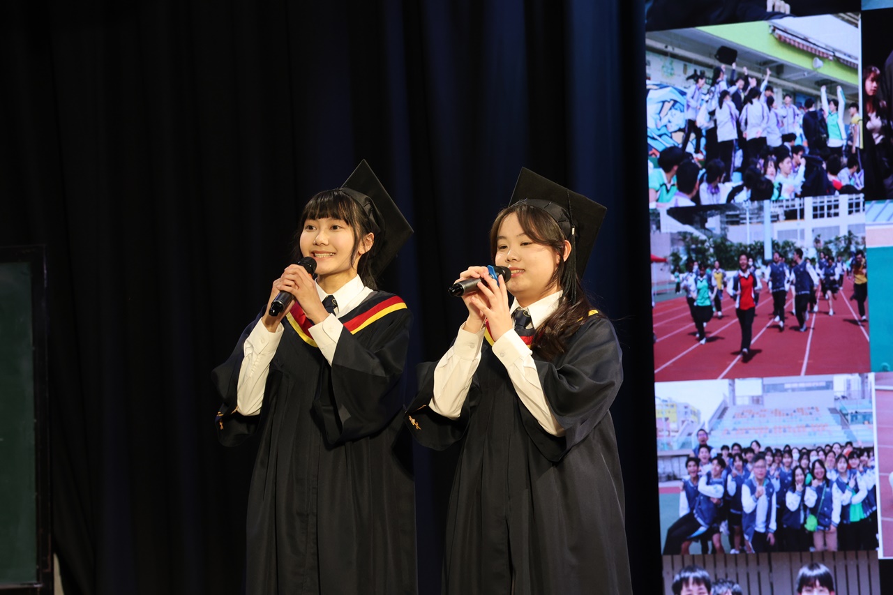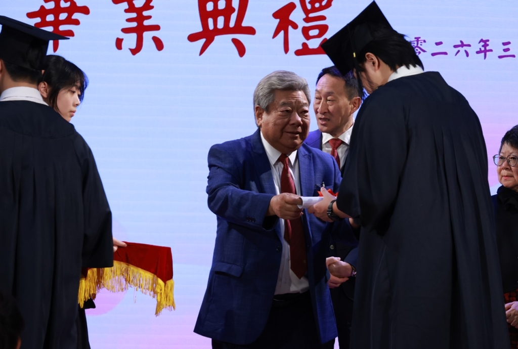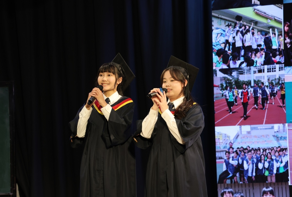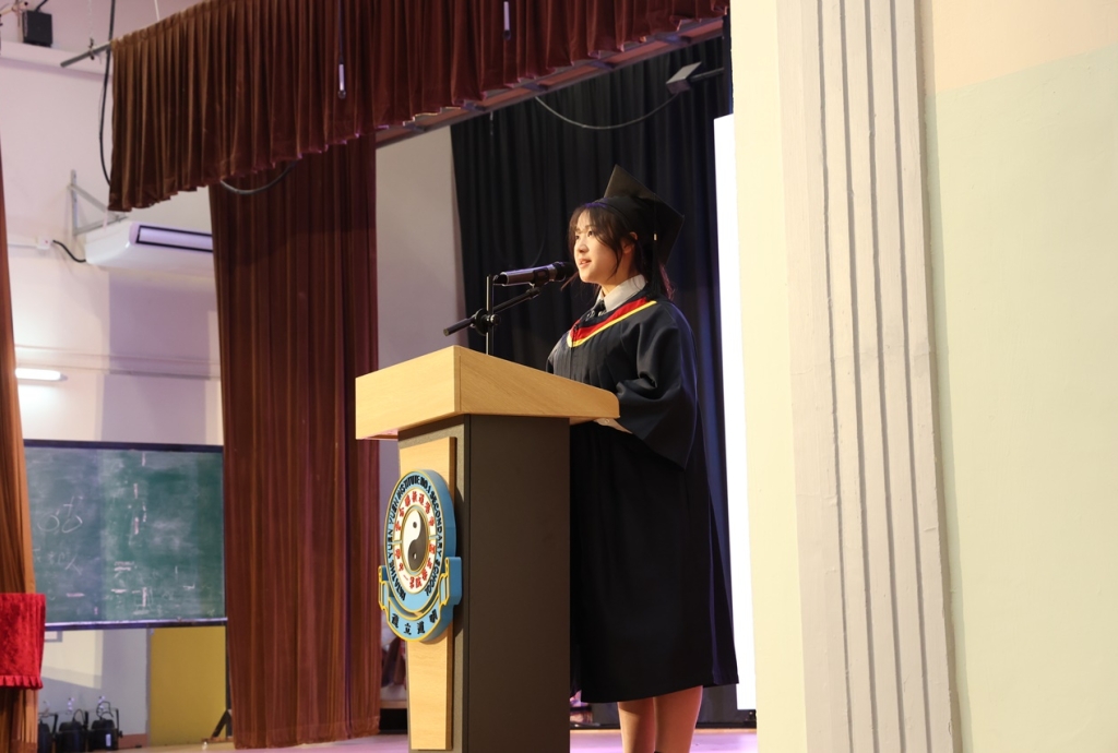典禮開始時,全體畢業生穿上畢業禮袍,在主禮嘉賓帶領下步入禮堂,全場肅立鼓掌,氣氛熱烈。鄧校監發表致勉辭,恭賀畢業班同學完成學業,達成夢想。大會安排所有畢業生逐一登上禮台,接受主禮嘉賓及班主任的祝福,並一同合照留念。同學們亦趁機向大家展示親手設計的心意磚,以表達對母校的情懷。畢業班代表秦晞悅同學(6C)在致謝辭中,衷心感謝母校對同學的關愛,並承諾努力應試,以答謝師長的悉心教誨。簡偉鴻校長在致勉辭上,為畢業班同學鼓勵打氣,並感謝嘉賓及家長的光臨。