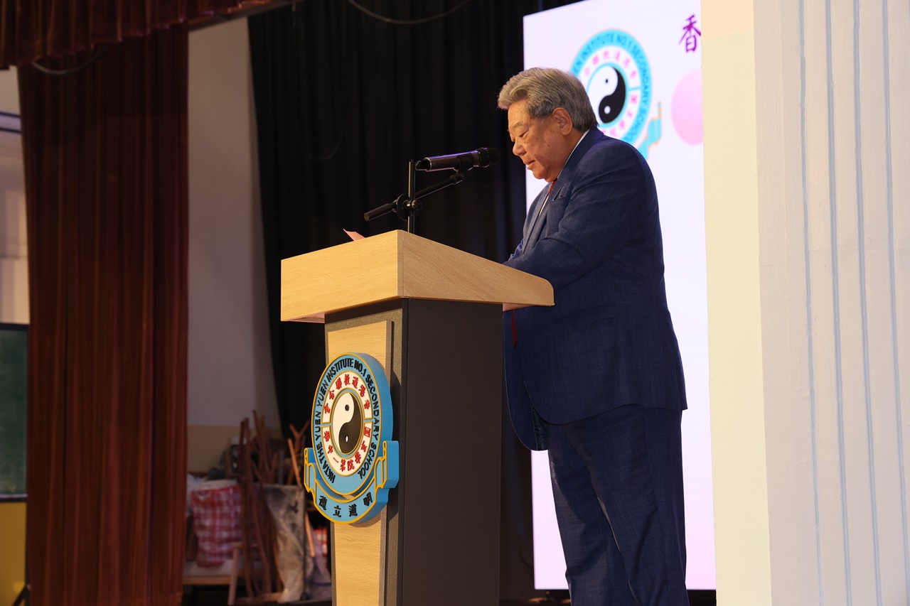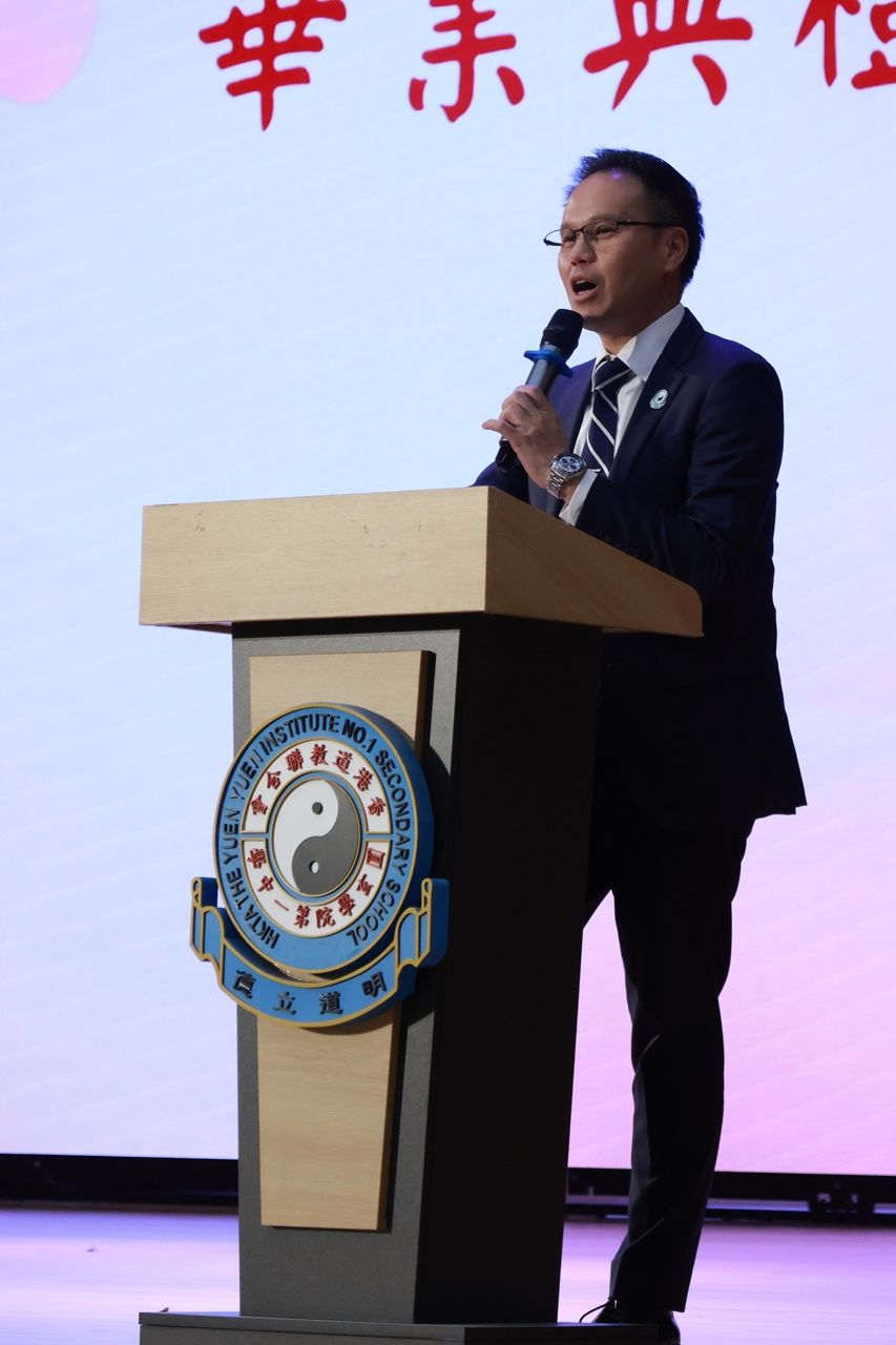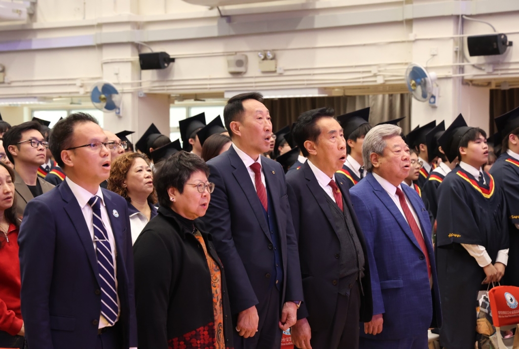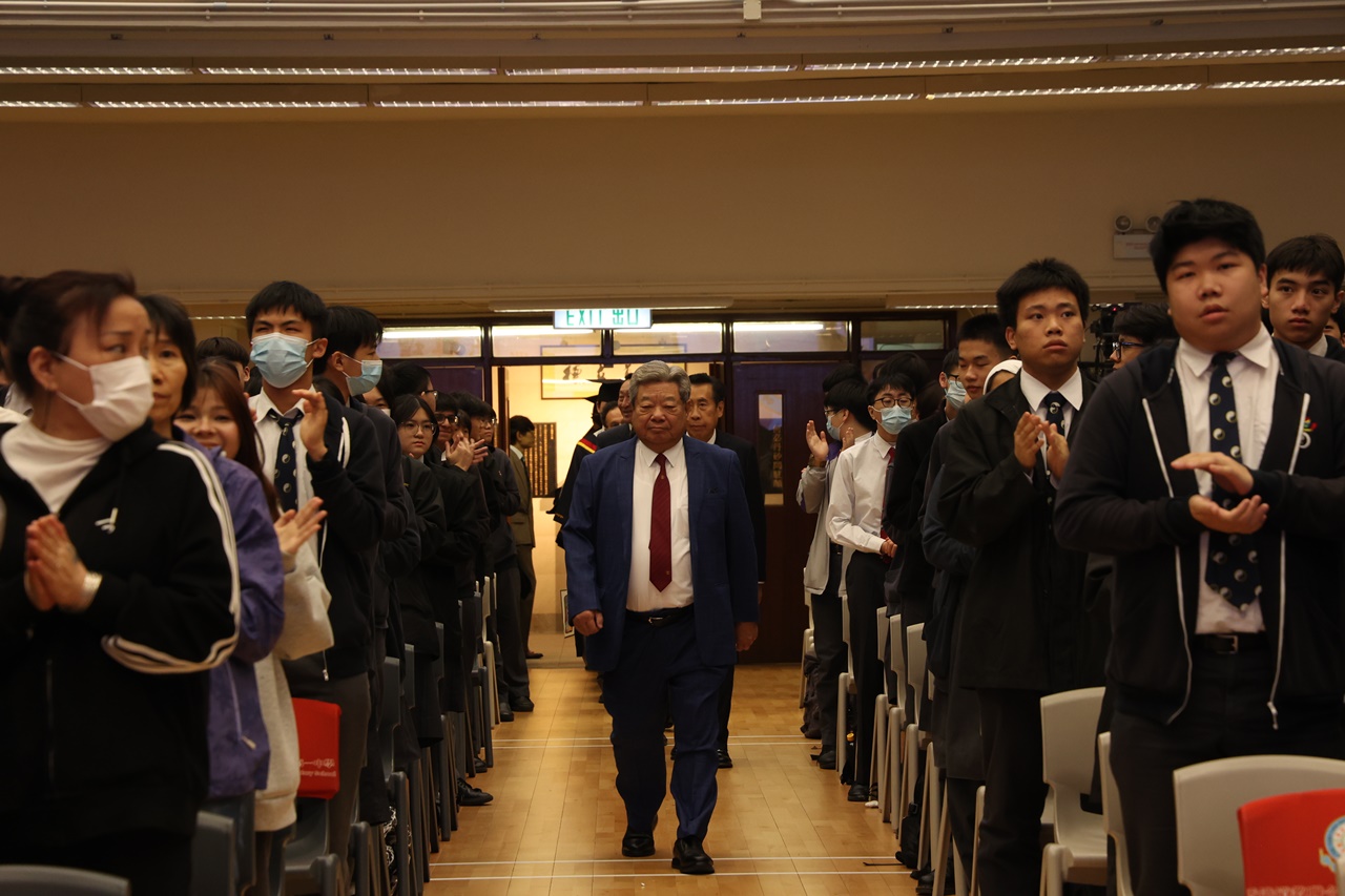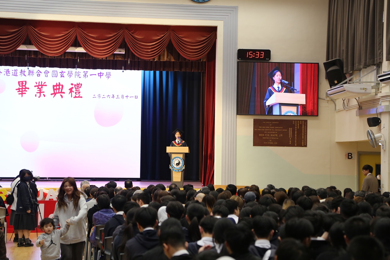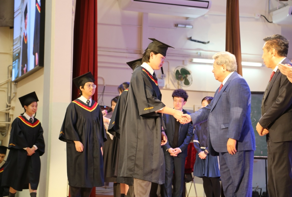 典禮開始時,全體畢業生穿上畢業禮袍,在主禮嘉賓帶領下步入禮堂,全場肅立鼓掌,氣氛熱烈。鄧校監發表致勉辭,恭賀畢業班同學完成學業,達成夢想。大會安排所有畢業生逐一登上禮台,接受主禮嘉賓及班主任的祝福,並一同合照留念。同學們亦趁機向大家展示親手設計的心意磚,以表達對母校的情懷。畢業班代表秦晞悅同學(6C)在致謝辭中,衷心感謝母校對同學的關愛,並承諾努力應試,以答謝師長的悉心教誨。簡偉鴻校長在致勉辭上,為畢業班同學鼓勵打氣,並感謝嘉賓及家長的光臨。